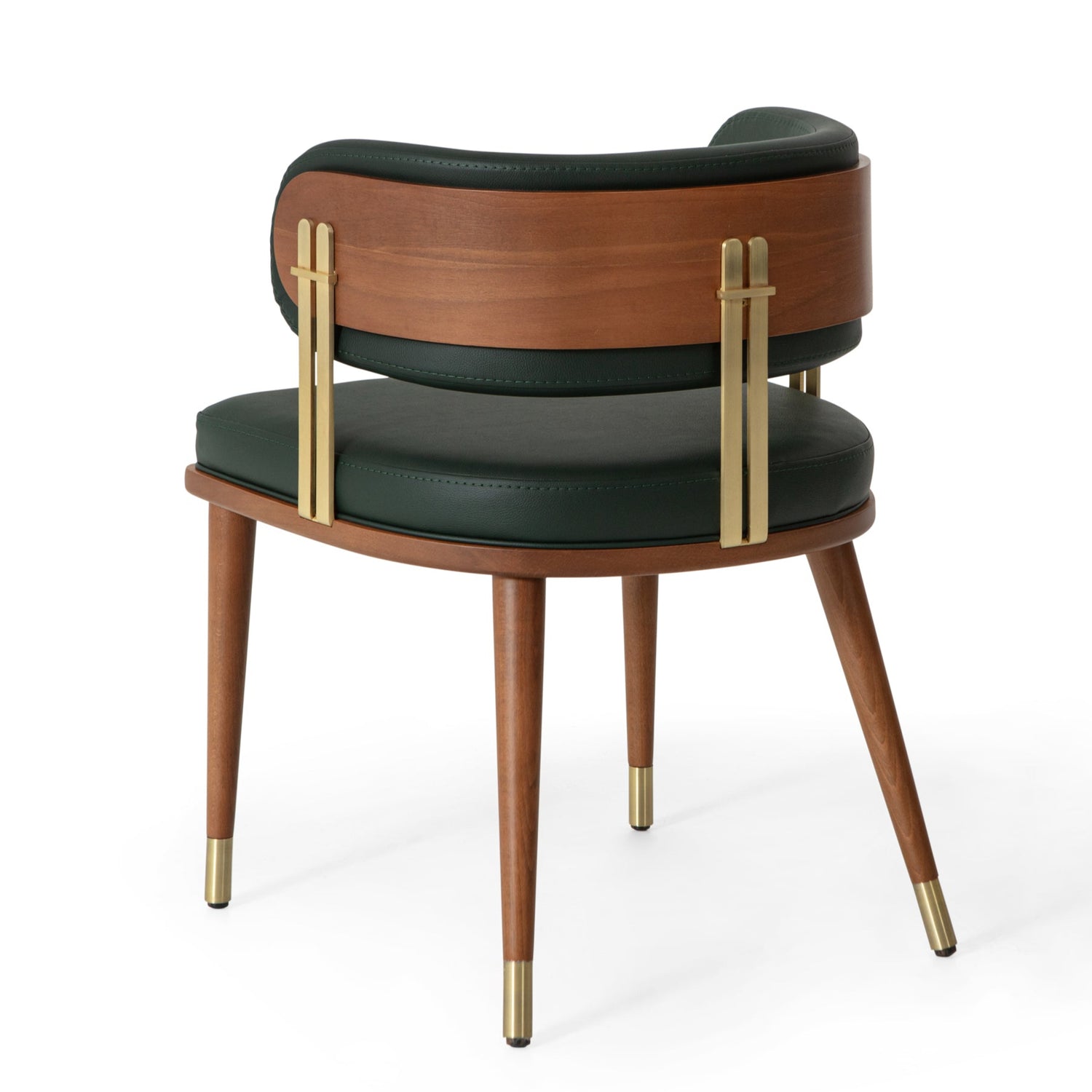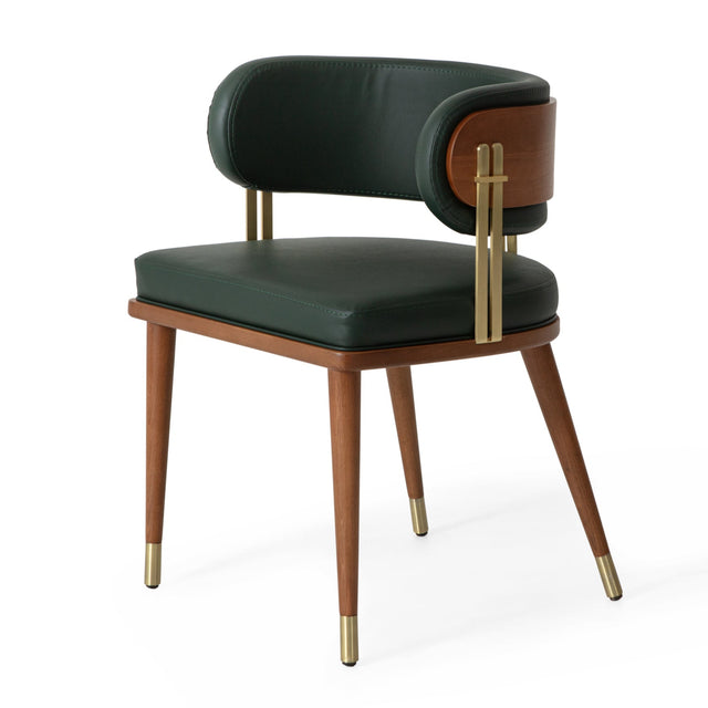 Táto elegantná stolička harmonicky kombinuje tmavozelené kožené čalúnenie , teplé drevo a kovové detaily z brúsenej mosadze , čím vytvára sochársky vzhľad inšpirovaný moderným dizajnom polovice minulého storočia .