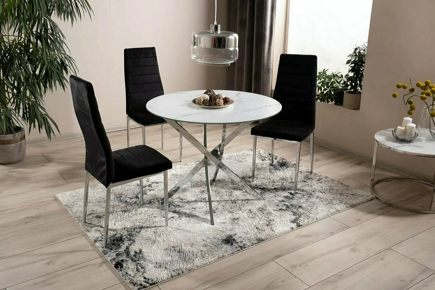 Moderný, čistý jedálenský stôl s nadčasovým dizajnom - pre domáce jedálne a kuchyne, kde je dôležitá praktickosť a stabilita.