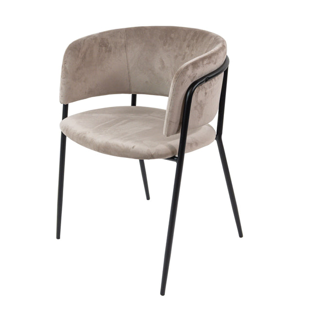 Jedálenská stolička KL Liam s elegantným, moderným vzhľadom a prírodným odtieňom ťavy je štýlovým doplnkom každého interiéru. Mäkké zamatové čalúnenie je príjemné na dotyk a pohodlné, zatiaľ čo čierne kovové nohy poskytujú stabilitu a čistý tvar. Polkruhové operadlo nie je len dizajnovým prvkom, ale aj ergonomickým riešením pre pohodlné sedenie.